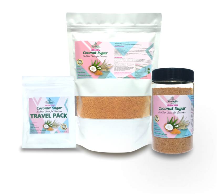 GULA KELAPA ASLI AL-AAFIYAHGula kelapa serbuk diperbuat daripada Nira Bunga kelapa. Tiada campuran bahan lain. 100% dari nira kelapa.Kandungan "Glysemic Index" (G.I.) yang rendah iaitu 35/100 berbanding dengan gula biasa.Rasa yang lebih lemak, manis dan wangi. Tekstur yang lebih lembut dari gula melaka. Pengganti kepada gula putih.Mempunyai pelbagai nutrisi.Boleh juga untuk "makan begitu saja".Antara khasiat dan kebaikan gula kelapa;Gula kelapa tinggi zat besi sekaligus mengurangkan dan mencegah anemia. Tidak seperti gula terproses, gula kelapa tidak menyebabkan keradangan, malah ia boleh mengatasi masalah kulit seperti jerawat. Kandungan phytonutrient yang dapat menurunkan paras gula dan kurangkan keradangan.Gula kelapa juga dikatakan boleh membantu membersihkan darah sekaligus racun yang terdapat di dalam tubuh. Selain membersihkan darah, gula kelapa dipercayai bagus dalam mengatasi masalah pencernaan. Kaya dengan vitamin dan mineral penting seperti Vitamin E, K, B6 dan Kalsium.Ketika anda mengalami batuk berkahak. Berhenti ambil gula terproses dan tukarkan kepada gula kelapa. Gula kelapa membantu melancarkan kahak dan mendinginkan tubuh.Gula kelapa memiliki sifat anti alahan, untuk anda yang menghadapi masalah asma atau eczema serta alergi, ganti gula anda dengan gula kelapa. Mengandungi inulin yang meningkatkan imunisasi badan sekaligus menyihatkan usus.Gula paling selamat dengan kandungan Glysemik indeks yang rendah. Sesuai untuk pesakit kencing manis. Inulin dalam gula kelapa menstabilkan gula dalam darah.Mempunyai kalsium yang merupakan nutrien penting untuk kesihatan tulang dan gigi.Cara penggunaan: Gantikan gula kelapa dengan gula putih dengan nisbah 1:1 ke dalam minuman atau makanan.